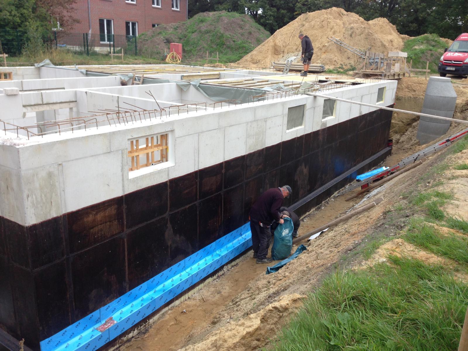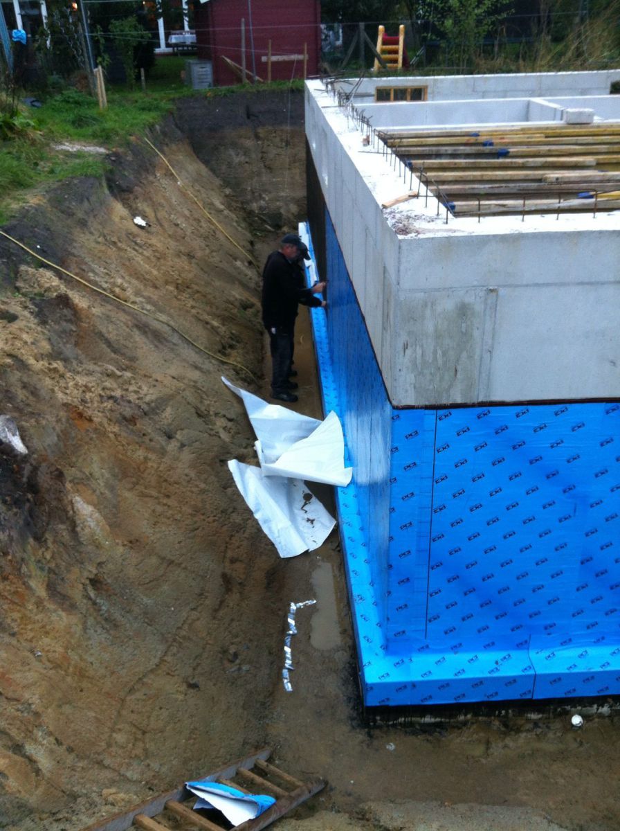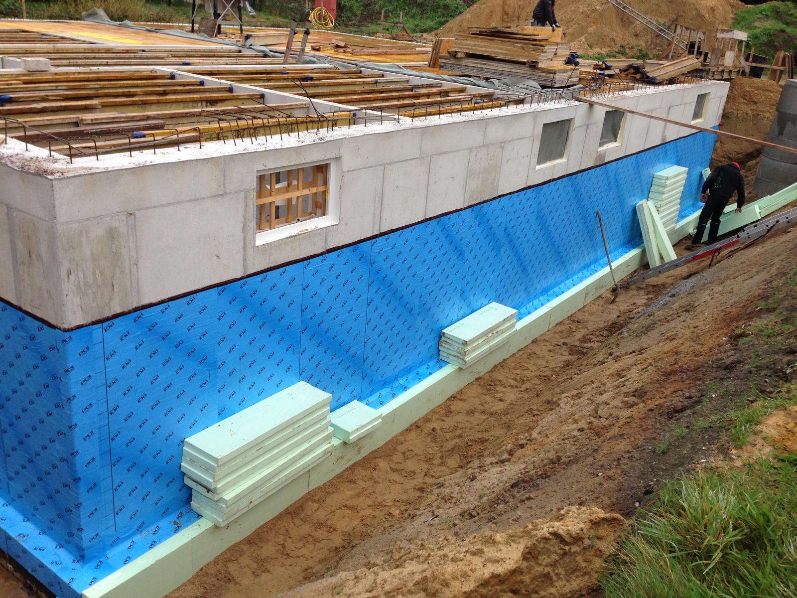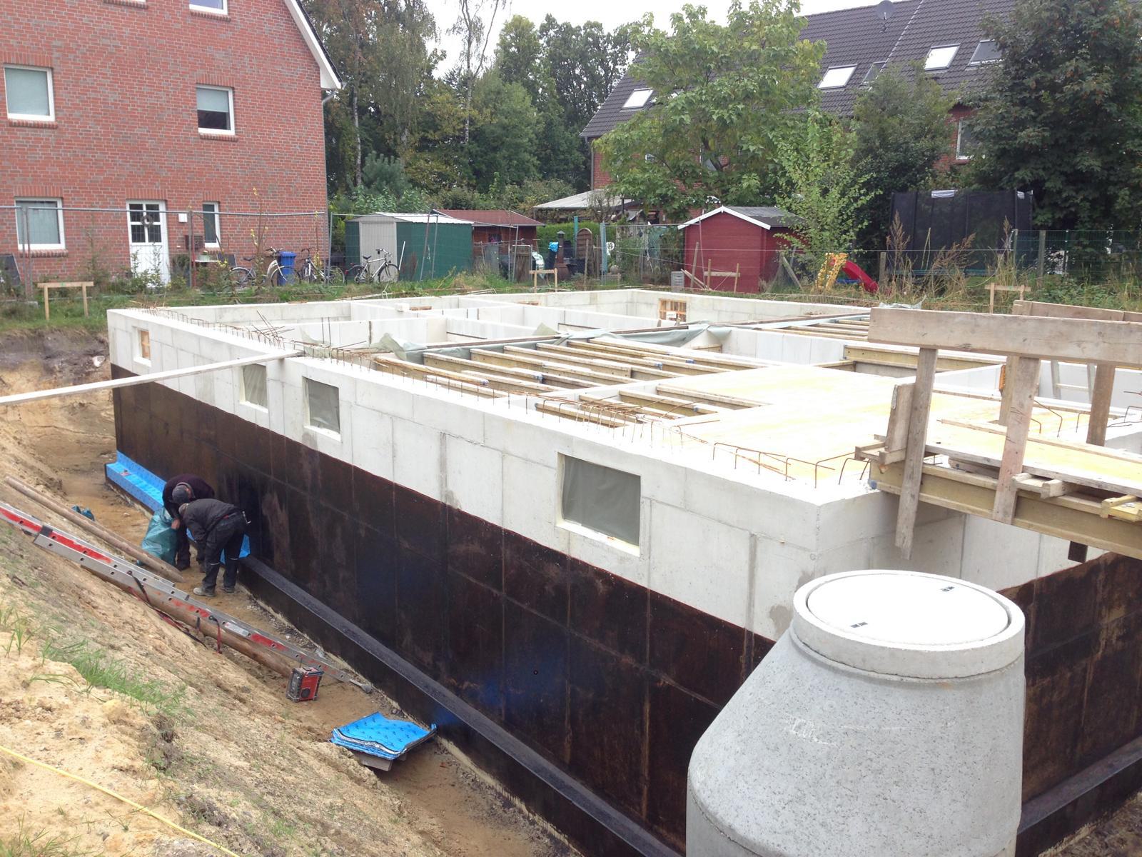Entweder arbeiten wir hier mit WU Beton oder Kalksandstein und erstellen anschließend eine Abdichtung von außen. Nach passenden und fachgerechten Vorarbeiten, die wir bei jedem Keller vorab ausführen, tragen wir eine Grundierung auf. Dies geschieht entweder mit einer selbstklebenden Bahn, mit einer Schweißbahn oder am besten mit einer zweikomponenten Dickbeschichtung, die wir nach sämtlichen Vorgaben und Richtlinien aufspritzen. Anschließend wird die gesamte Abdichtung mit einem dreilagigen Schutz überarbeitet, damit sie vor Außendruck und Bewegungen im Erdreich geschützt ist.
