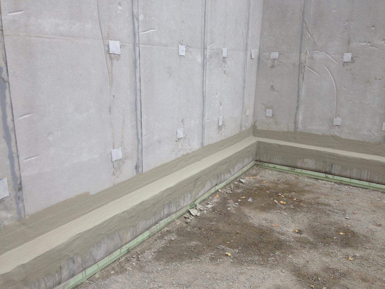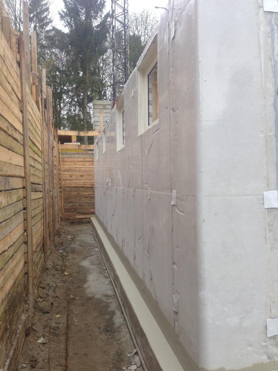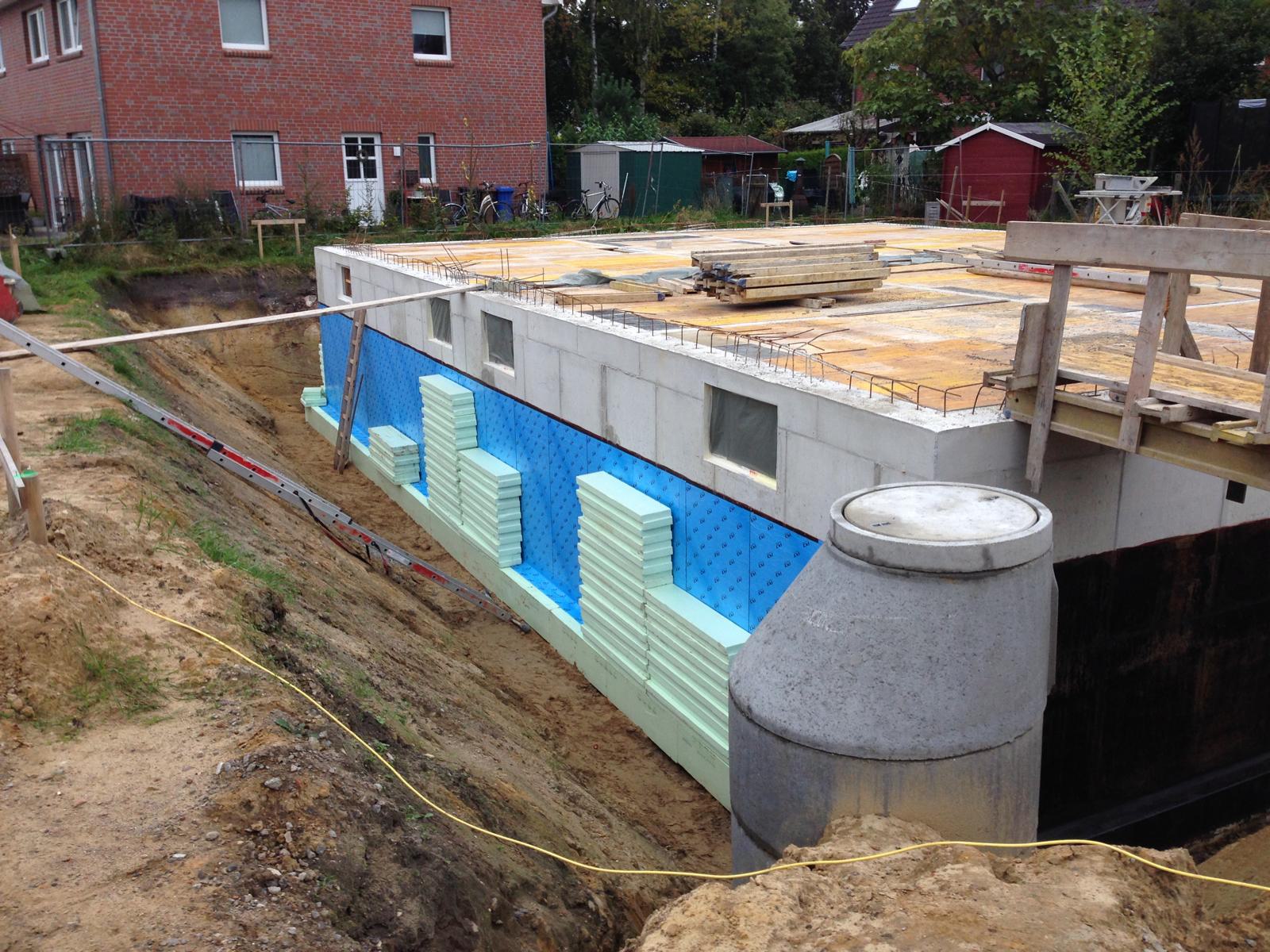 Entweder arbeiten wir hier mit WU Beton oder Kalksandstein und erstellen anschließend eine Abdichtung von außen. Nach passenden und fachgerechten Vorarbeiten, die wir bei jedem Keller vorab ausführen, tragen wir eine Grundierung auf. Dies geschieht entweder mit einer selbstklebenden Bahn, mit einer Schweißbahn oder am besten mit einer zweikomponenten Dickbeschichtung, die wir nach sämtlichen Vorgaben und Richtlinien aufspritzen. Anschließend wird die gesamte Abdichtung mit einem dreilagigen Schutz überarbeitet, damit sie vor Außendruck und Bewegungen im Erdreich geschützt ist.